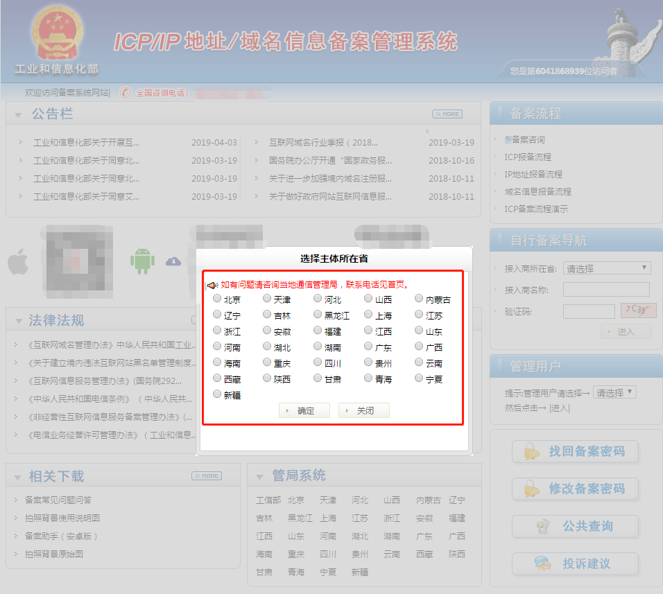 第二步:點擊找回備案密碼,會彈出一個窗口讓選擇地區,我們選擇我們備案所在的地區,然后點擊確定。