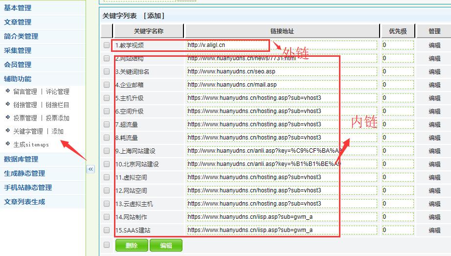 1、登錄網站后臺-點輔助功能-關鍵詞管理/添加,如下所示: