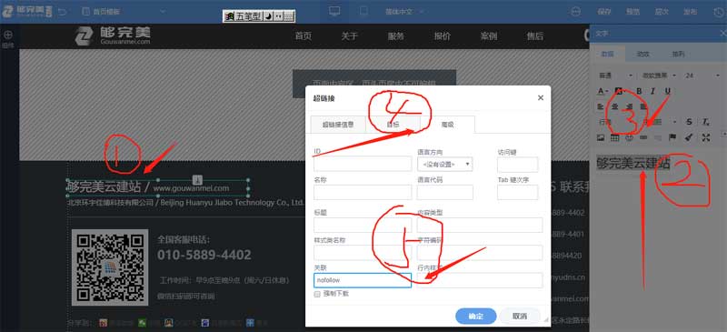 SAAS網站建設是沒有FTP文件編輯權,但同樣可以對文字A標簽添加nofollow屬性值,方法:選擇文字-點擊超級鏈接-高級-關聯值填入:nofollow即可,如下圖所示