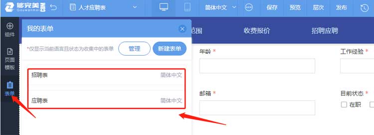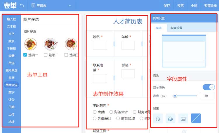 接下來就是表單制作,系統提供了表單各種類型與設計容器,網站制作設計師根據企業需求來設計字段表,如下圖所示。設計好表單后點開始收集,開始收集意味著表單允許在線提交收集內容了