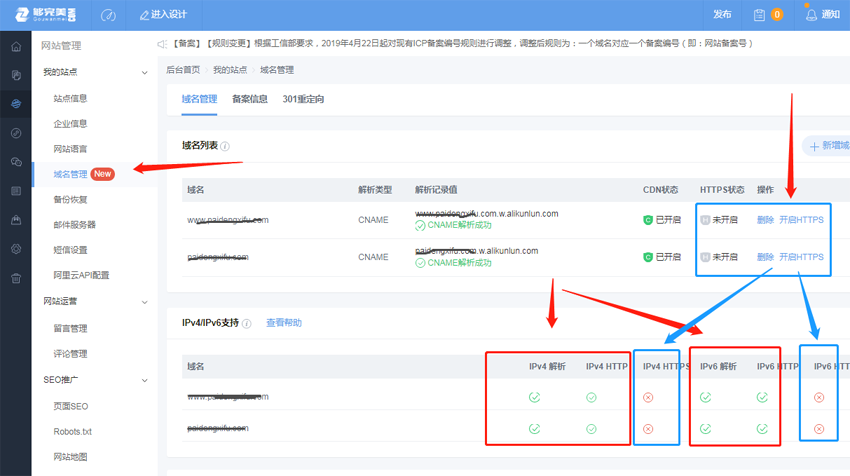 夠完美建站綁定域名提示支持IPv4/IPv6協議,如下圖所示