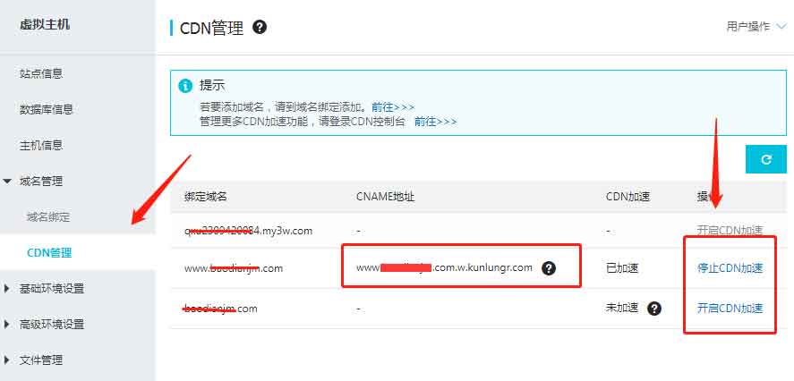 虛擬主機(jī)免費(fèi)開(kāi)啟CDN方法,登錄主機(jī)控制面板,點(diǎn)域名管理-CDN管理-開(kāi)啟CDN加速,待幾分鐘后控制面板將生成CNAME地址,此地址為CDN加速解析地址...