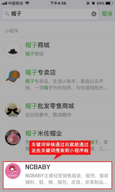 審核通過后微信用戶就可以通過這些關(guān)鍵詞搜索到微信小程序了。
